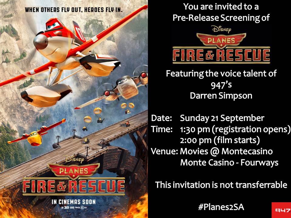 Ster-Kinekor will have pre-release screenings of Planes 2: Fire and Rescue in 3D on Wednesday the 24th, which is a public holiday. It will be screened at normal showtimes at:
